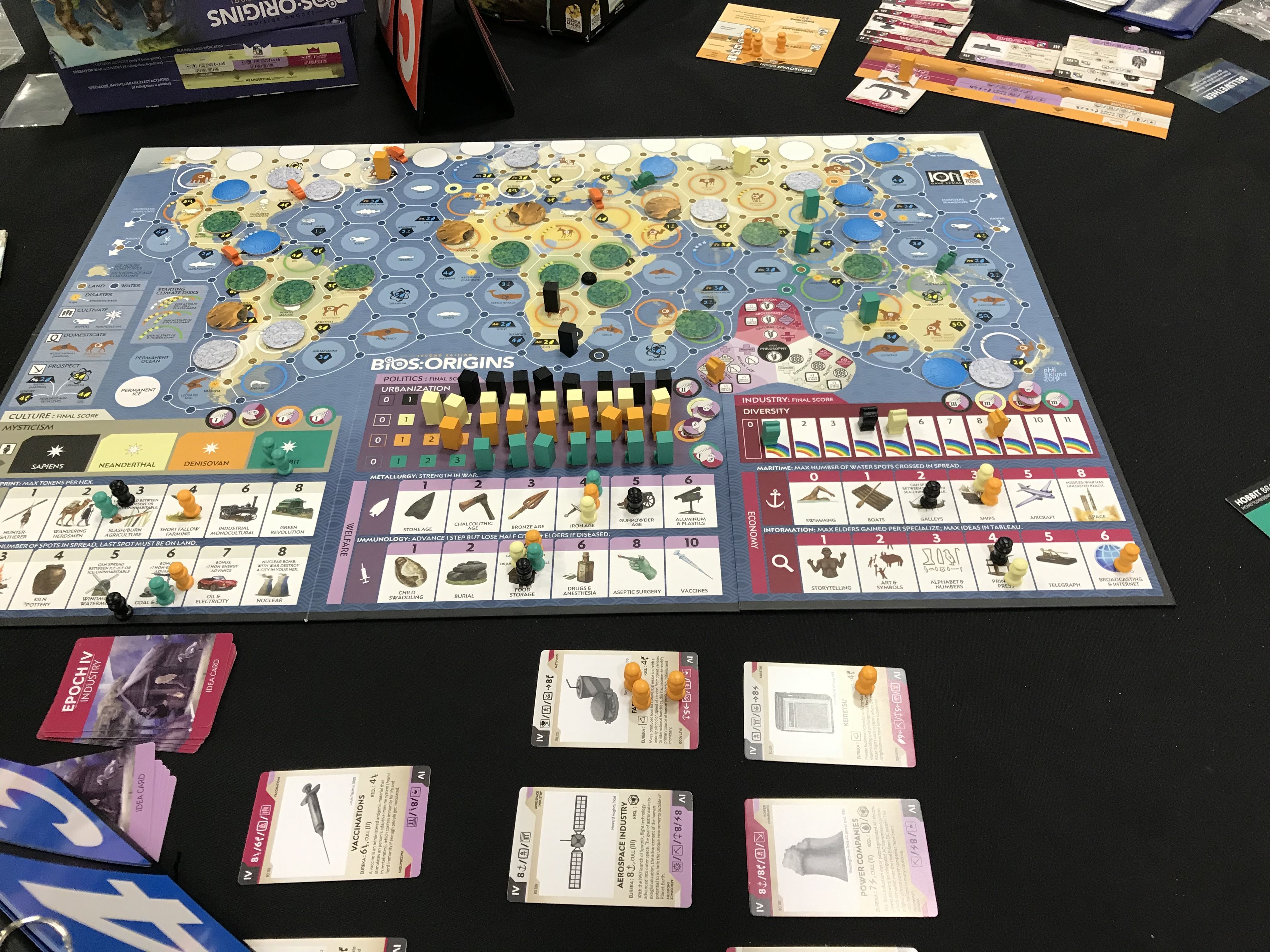 Bios:Origins is the 3rd part of the Bios Trilogy. The action starts much earlier than most Civilization games: 200,000 years ago or even earlier. One to four players represent the human subspecies extant at that time: Sapiens, Neanderthal, Denisovans, & Hobbits. Take them on an adventure to enlarge your brain, acquire language, discover new worlds, domesticate strange beasts (such as riding war kangaroos or mammoths), discover the wonders and terrors of religion, dive for pearls, challenge the gods, enslave rival hominins, and perhaps enter the Enlightenment. Although wars of conquest and religion are possible, most of the fighting will be internal. You have only limited control of over your ruling class, and if your priests are in control and do a poor job, they will get killed and usurped by merchants or warlords.