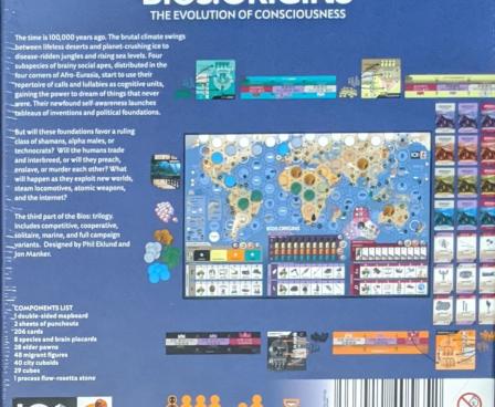 The game integrates with Bios:Genesis and Bios:Megafauna, so that you can start as a variety of intelligent but not-quite lingual marine or terrestrial creatures. Two maps and 26 hex chits are included, to accommodate variable landforms and cratons on habitable Earth, Mars, or Venus. Solitaire and cooperative variants are included.