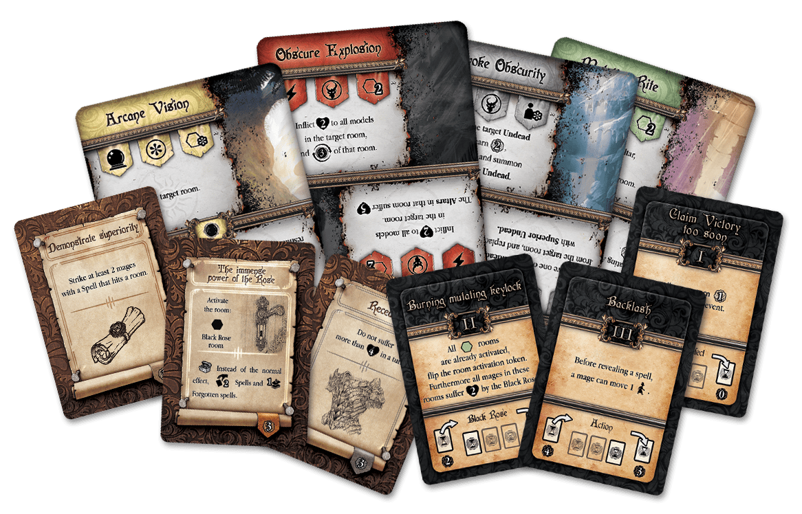 Mages fight each other in a modular arena of hexagons called "rooms". They summon powerful creatures, cast destructive spells, or devise dark deceptions with their enchantments. The game system is divided into different phases. Each turn, after choosing new spells from the six schools of magic, players plan their strategy in advance, placing cards face down. Later, they reveal the played cards to kill each other, solve missions, summon creatures, or destroy the prison rooms, one against each other and against the Black Rose (the playing system).