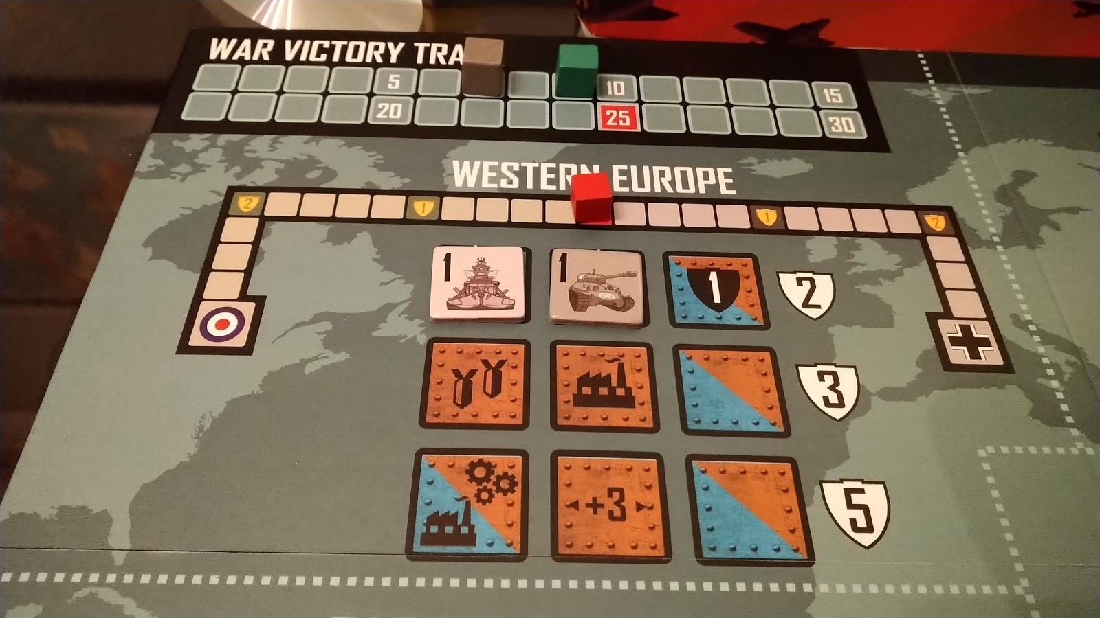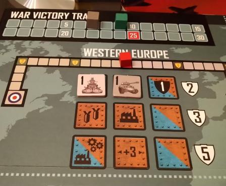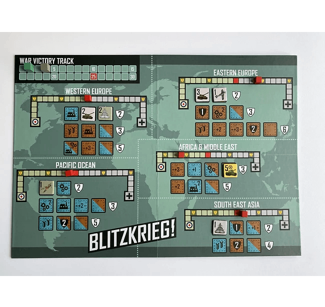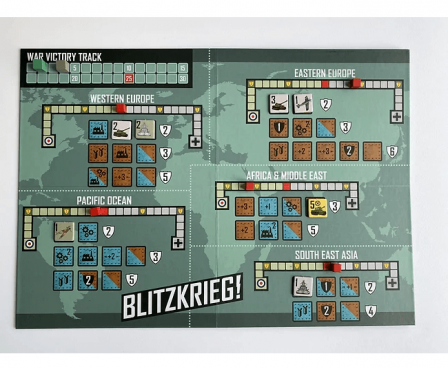 Players draw army tokens from a bag to determine their starting forces and to replenish their losses. Rather than ‘fighting’ battles with dice or cards, players allocate their military resources to each theatre’s campaigns, winning victory points, further resources, special weapons, and strategic advantages as they play. Refight World War Two several times in one evening!