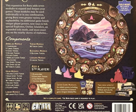 The Ambelau expansion adds seven discrete modules to expand and deepen your games of Buru, including a new board/region, multiple mini-expansions, and the option for a fifth player. These modules may be used individually or in any combination.