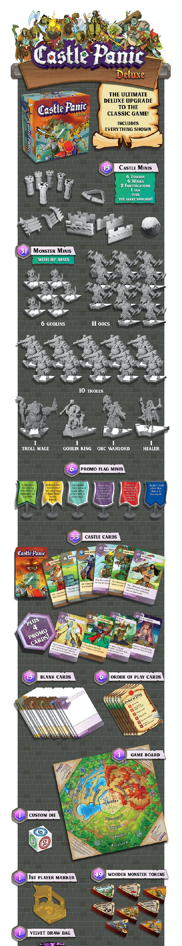 The Castle Panic Deluxe is an upgraded version of Castle Panic , it's still the same great game. But now with new art, plastic walls and towers for the Castle, wooden monster tokens, and monster minis with unique damage tracking spinning bases!