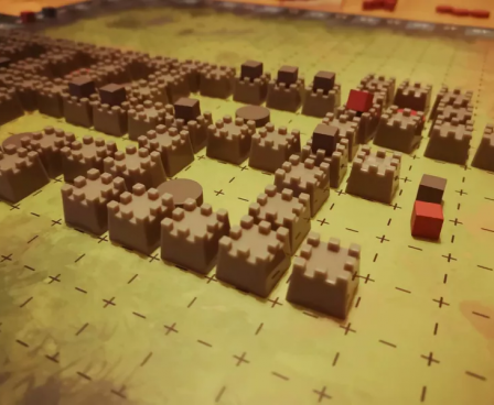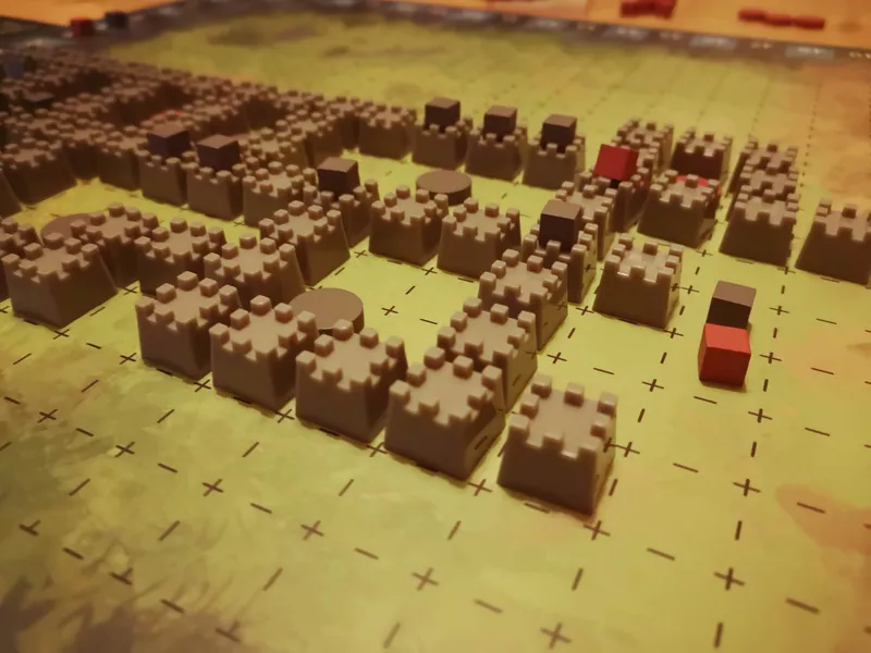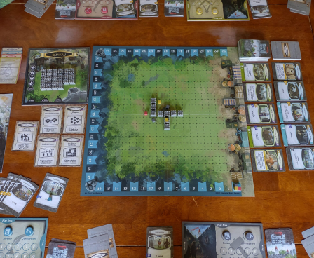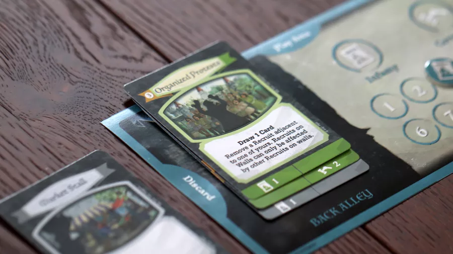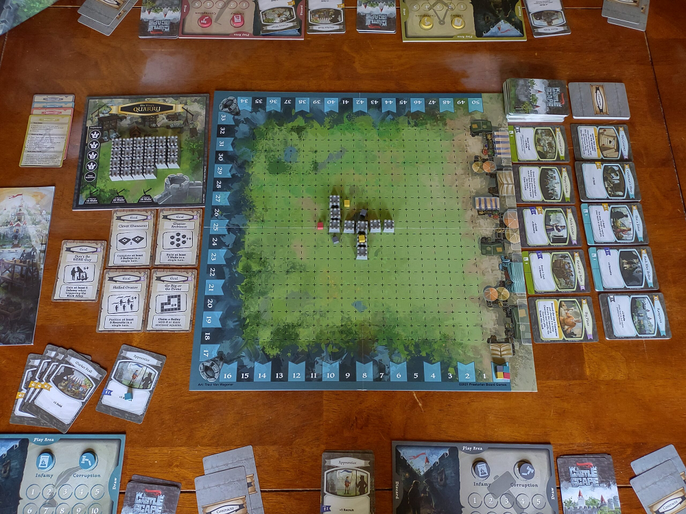 Each player begins the game with a basic deck of cards (gold, recruits, walls, and a few clumsy thieves) and a couple hidden goals. The game board starts with one wall in the center, and players must build outward, always adding walls adjacent to other walls. Whenever a Bailey is completed, Renown(points) will be awarded based on how large that Bailey is, and the player with the most Influence in that Bailey will claim the Renown. Starting in the same area and building outwards forces all players to have a high level of player interactivity and decision making so that no two games will ever feel the same. Inspections will remove significant amounts of Influence from the game board, giving players additional ways to influence how things play out.