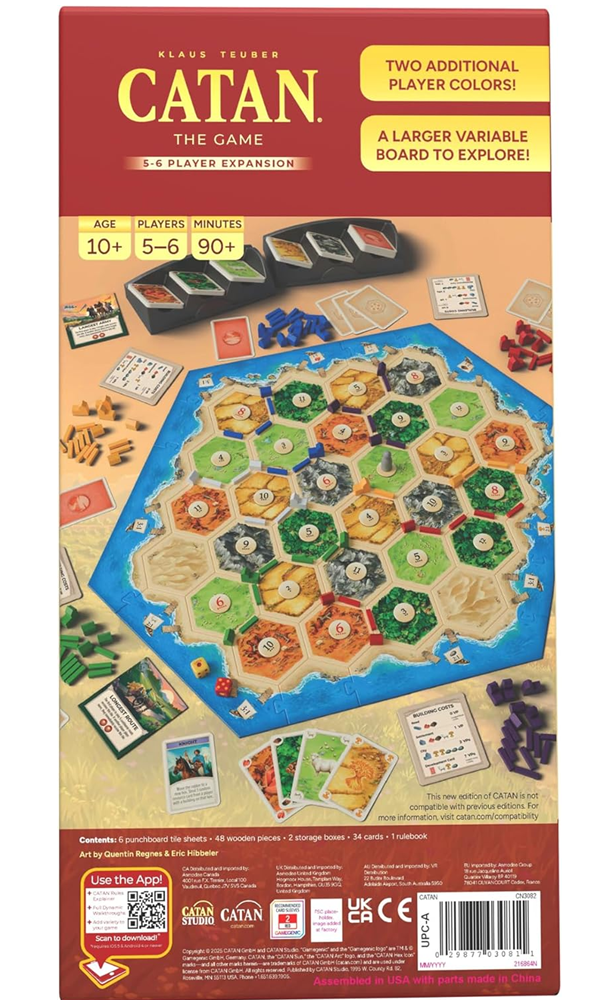 Bring more friends to the island of Catan! Adventures this big deserve to be shared with even more friends. Invite up to two additional players to your CATAN game for even more trading and building fun! The 5-6 Player Expansion adds additional pieces and components for more players and adds a simple turn-taking mechanism to engage more players throughout.