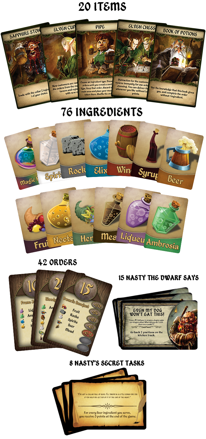 These locations are divided in 6 sections. The Main area, where the guests are located and from where each player must pick up an Order, Cellar where all the ingredients that are used to complete the Orders are located, Kitchen where players can work to receive different rewards, as well as the Chores section. Also, the board features the Wizards workshop where the players can seek help for completing the Orders and Nasty the Dwarf's office where the players can go and try to suck up to the boss and badmouth a coworker.