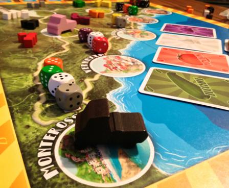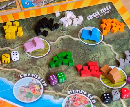 In Cinque Terre, a game of strategy, players compete to sell the most valuable produce in the five villages. Players act as farmers and operate a cart in which they will harvest produce and deliver them to the five villages to sell. Additionally, players will compete for Produce Order cards, which reward Lira points for selling desirable produce in specific villages. Players track sold produce in each village using their Fulfillment Cards. The winner is the player who gains the most Lire by selling valuable produce, gaining popularity in the villages, and fulfilling Produce Orders.