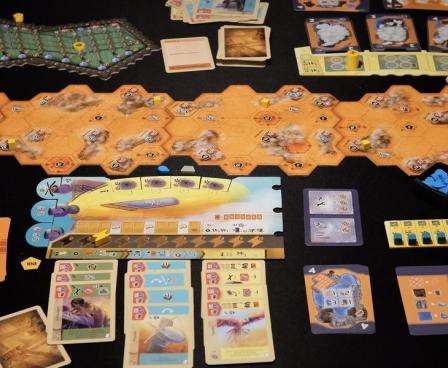 An innovative sleeving mechanism makes a new, more immersive, form of resource gathering possible. Players try to predict which cloud-covered terrain will contain the desired amount of resources or where additional actions are possible. Resources allow players to develop useful upgrades for their airships or attract new crew members.