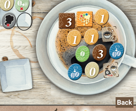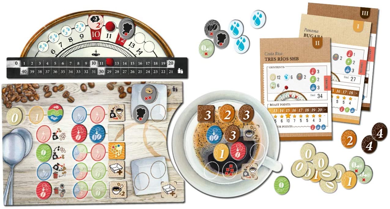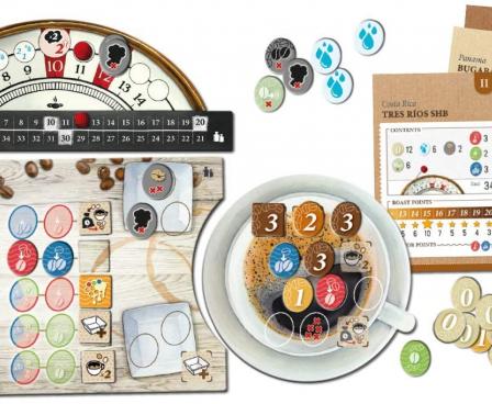 Coffee Roaster is a solitaire pool-building game. You choose a variety of coffee beans you want to roast, and put a number of tokens specific to that variety into a bag. Each turn, you draw a number of bean tokens randomly from the bag to advance their roast level. When you are finished, you make a cup-testing to check the taste of your coffee and score points accordingly. Each variety has its own target roast level, but approaching the target is not enough for perfect roasting; you also have to even out the roast level of each bean, while not spoiling the flavor of that variety.