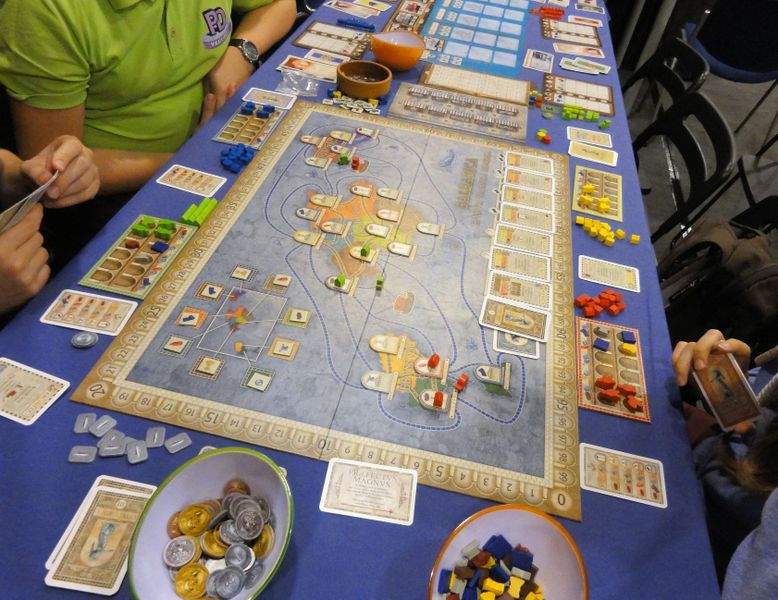 Each player starts with two ships already at sea. There is no capital city to start from. Land colonists are built only later in the game, but can switch their position between the islands.