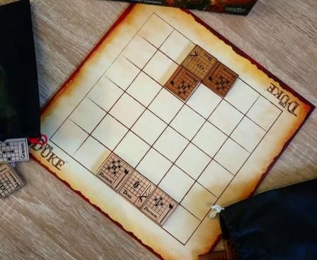 In The Duke, players move their troop tiles around the board and flip them over after each move. Each tile's side shows a different movement pattern. If you end your movement in a square occupied by an opponent's tile, you capture it. Capture your opponent's Duke to win!