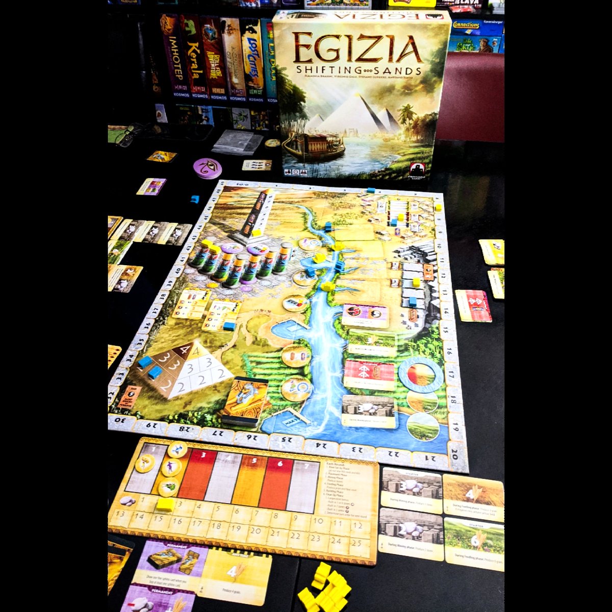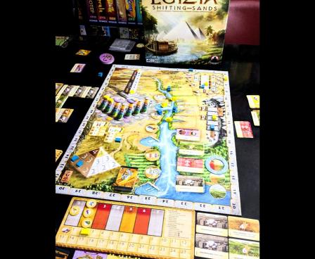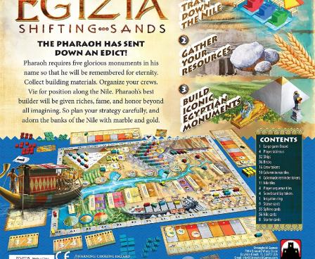 Egizia: Shifting Sands is an updated version of the beloved strategy game Egizia. Players travel down the Nile, placing boats as they go, to collect resources that will help them construct some of Egypt's most famous monuments. With new monuments to build, new cards to collect, and a constantly shifting river, Egizia: Shifting Sands Edition is a streamlined, modern update that both longtime fans and new players can easily pick up and enjoy.