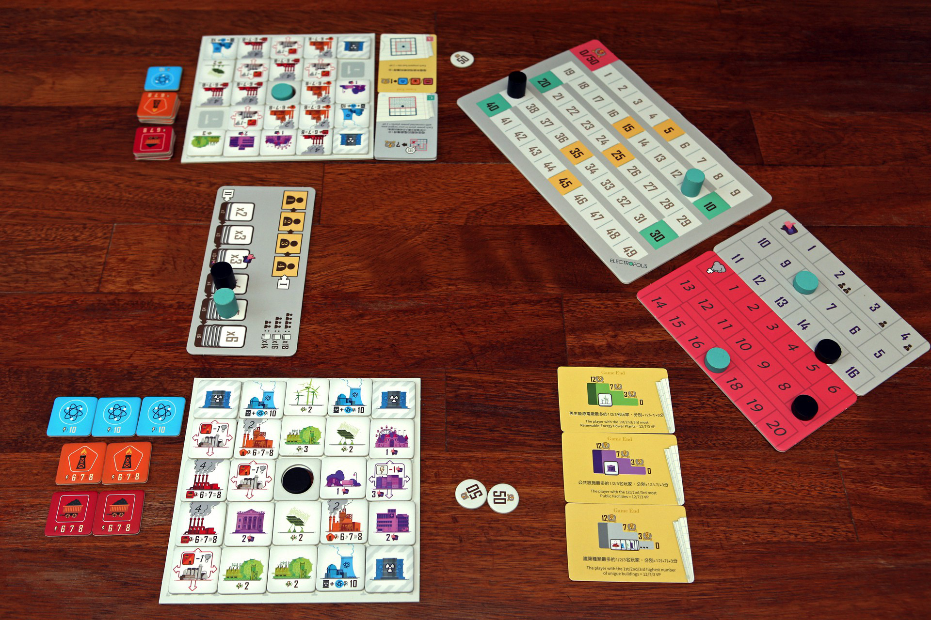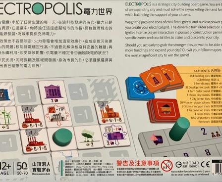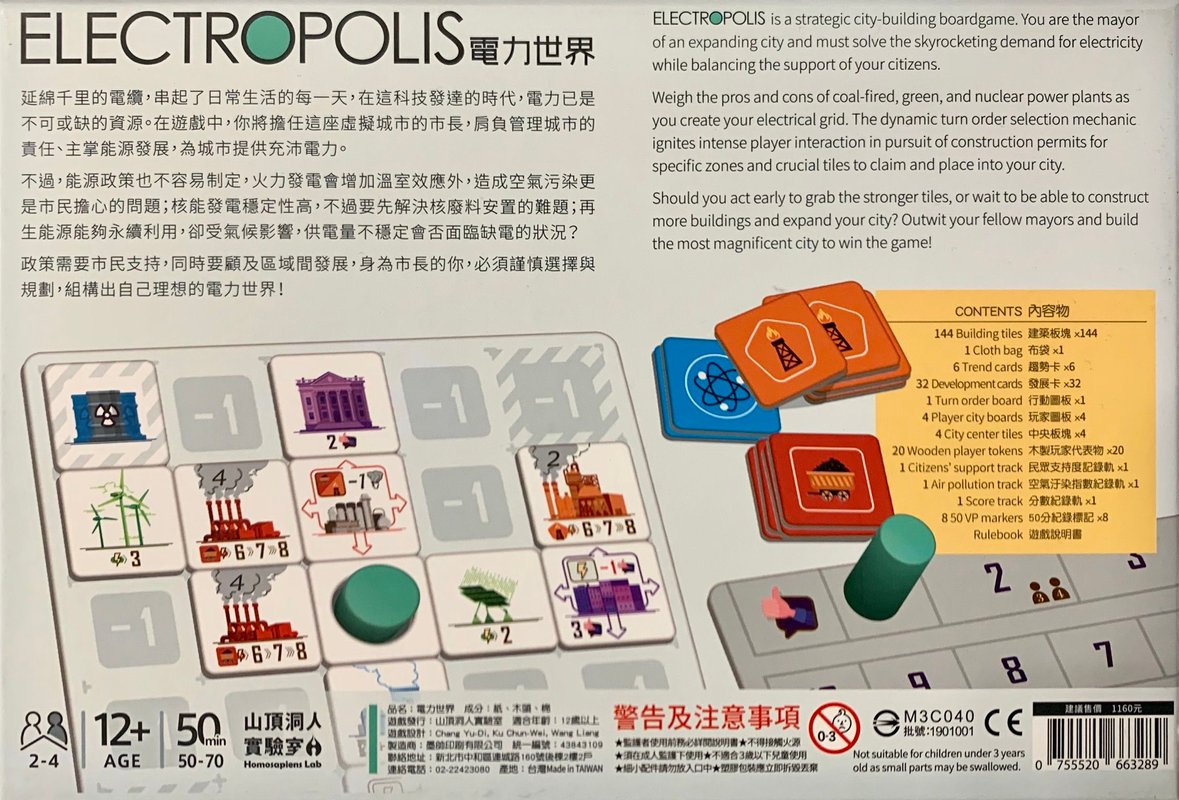 Electropolis is a strategic city-building boardgame. As the mayor of the ever-growing city, you must plan out the best energy solution to meet the skyrocketing demand of electricity.