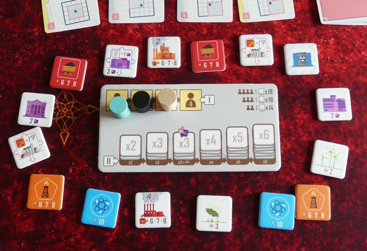 The pros and cons of coal-fired plants, green energy, and nuclear power challenge you with tough decisions throughout the game. The dynamic turn order selection mechanic ignites an intense player interaction in pursuit of construction permits for specific zones and crucial tiles to be claimed.