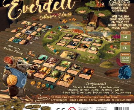 Within the charming valley of Everdell, beneath the boughs of towering trees, among meandering streams and mossy hollows, a civilization of forest critters is thriving and expanding. From Everfrost to Bellsong, many a year have come and gone, but the time has come for new territories to be settled and new cities established. You will be the leader of a group of critters intent on just such a task. There are buildings to construct, lively characters to meet, events to host—you have a busy year ahead of yourself. Will the sun shine brightest on your city before the winter moon rises?