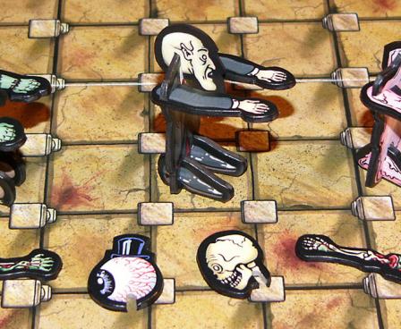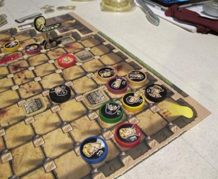 Players could reach the exit in only seven turns if everything were peaceful and quiet, but unfortunately the dungeon is also the home of a very hungry monster! Each round, players take turns moving one disk at a time, flipping over the disk after moving it to reveal the movement points available for the next round. They can try to lead the monster, who is always after fresh prey, to opponents' pieces, but they may find themselves eaten instead! Pieces can slide along blood slicks or might be crushed between a boulder and a wall. You can even try to get the monster to teleport to another part of the board, where it will fall upon its next victim!