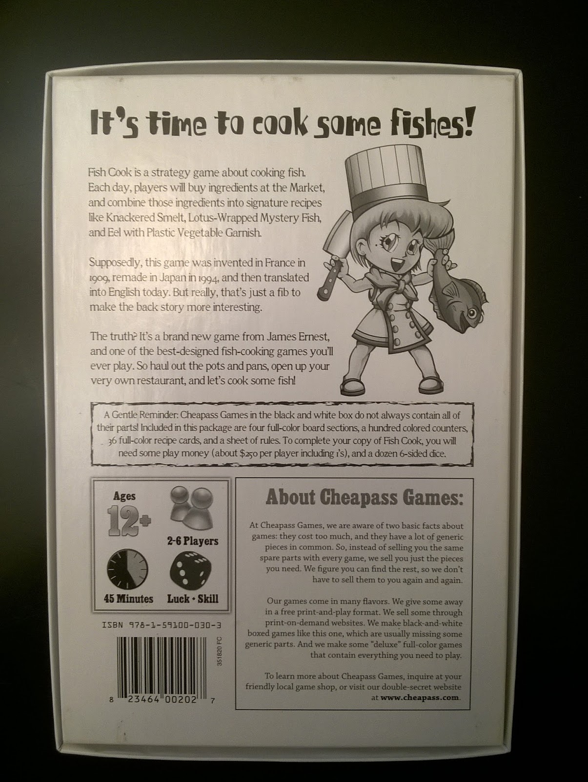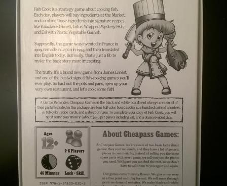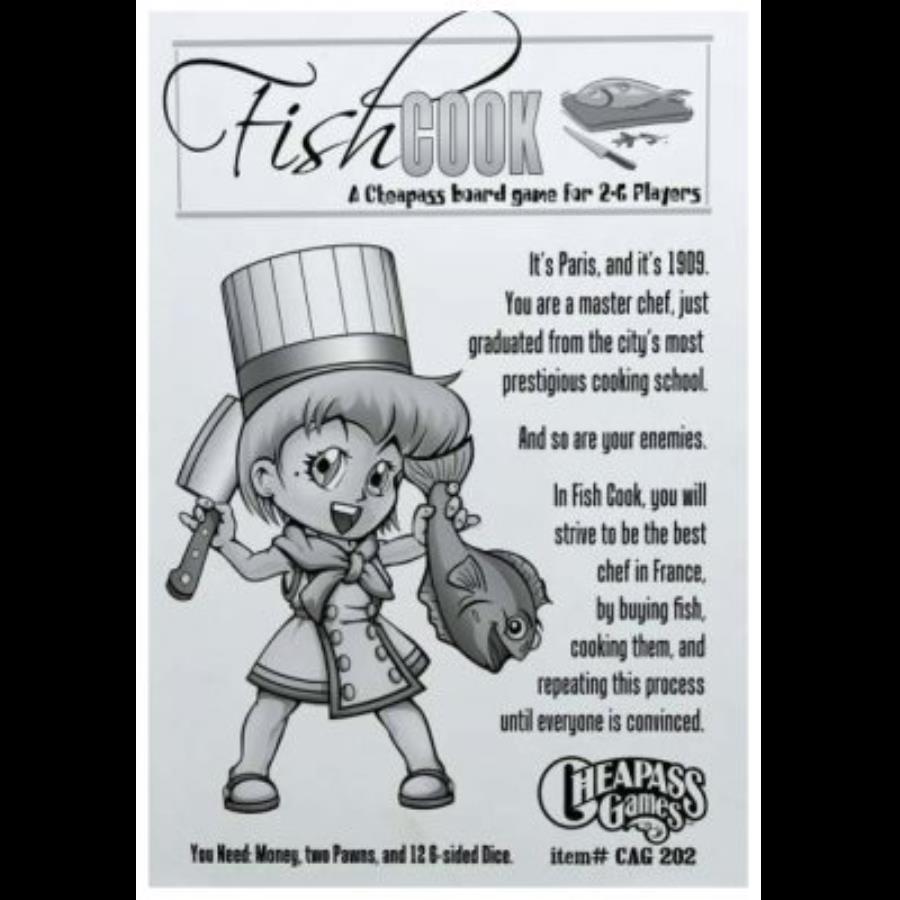 Fish Cook is a simple Euro-style board game in which players take the role of chefs. The game is divided into several "days" that have two parts: Morning and Evening. In the morning, players buy ingredients from the fish market and farmer's market; in the evening, they cook recipes and earn money. The strategy revolves around buying ingredients as cheaply and efficiently as possible, in addition to stealing the good ideas of your fellow chefs.