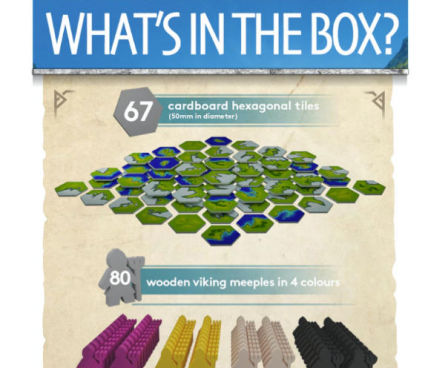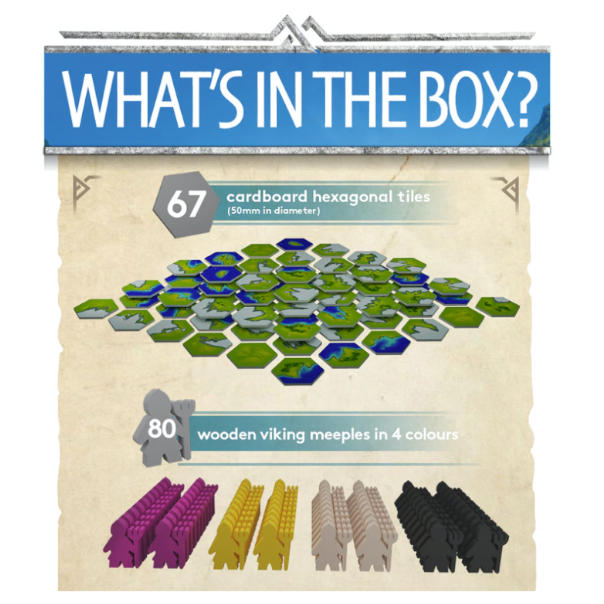 Fjords is a tile-laying game that takes place in two phases. First, the players explore the fjords around them by laying hexagonal landscape tiles. Second, beginning from the encampments placed during phase one, players will walk the landscape, claiming as much of the plains and cliffs as possible.