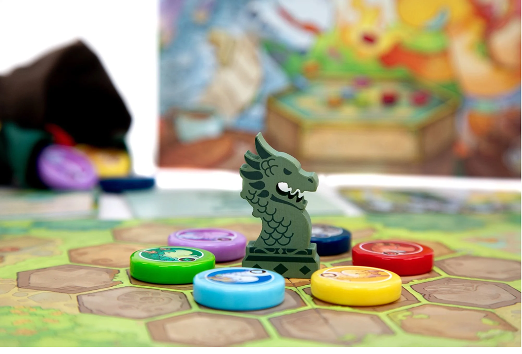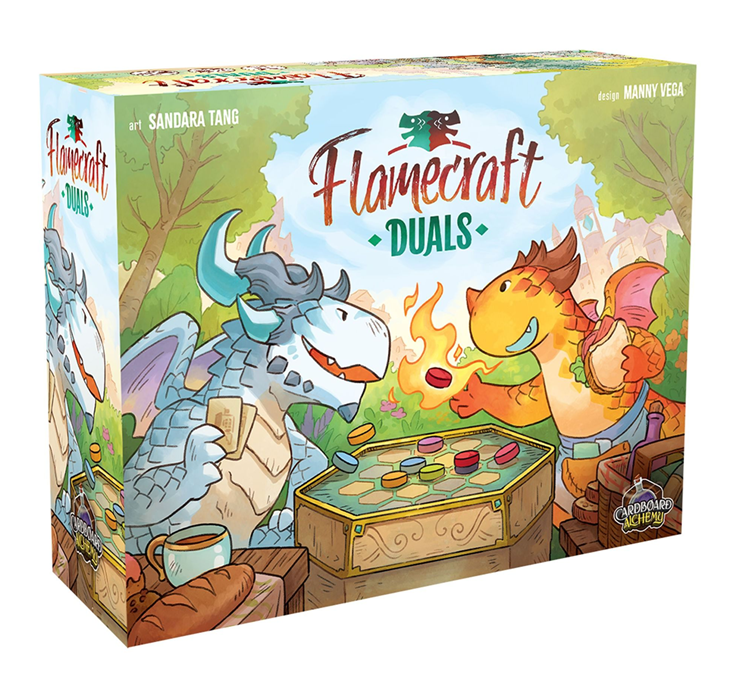 Flamecraft Duals is a two-player abstract pattern-building game that takes about 30 minutes to play. Each round, a player draws a dragon from the bag and places it on the shared central board. Every dragon type has a special ability that can be fired up to draw more dragons or rearrange those already on the board. You want to match three dragons on the board to the pattern on the shop cards in your hand to score them. Once all the dragons are drawn from the bag, the game ends and the player with the highest score wins.