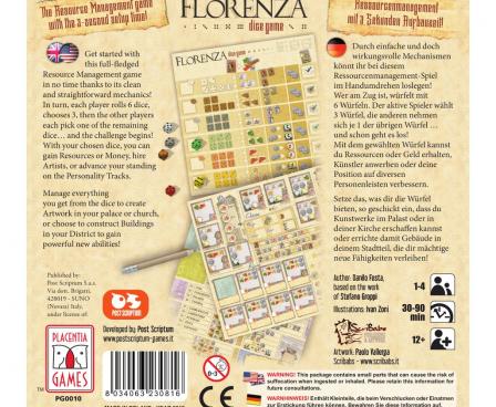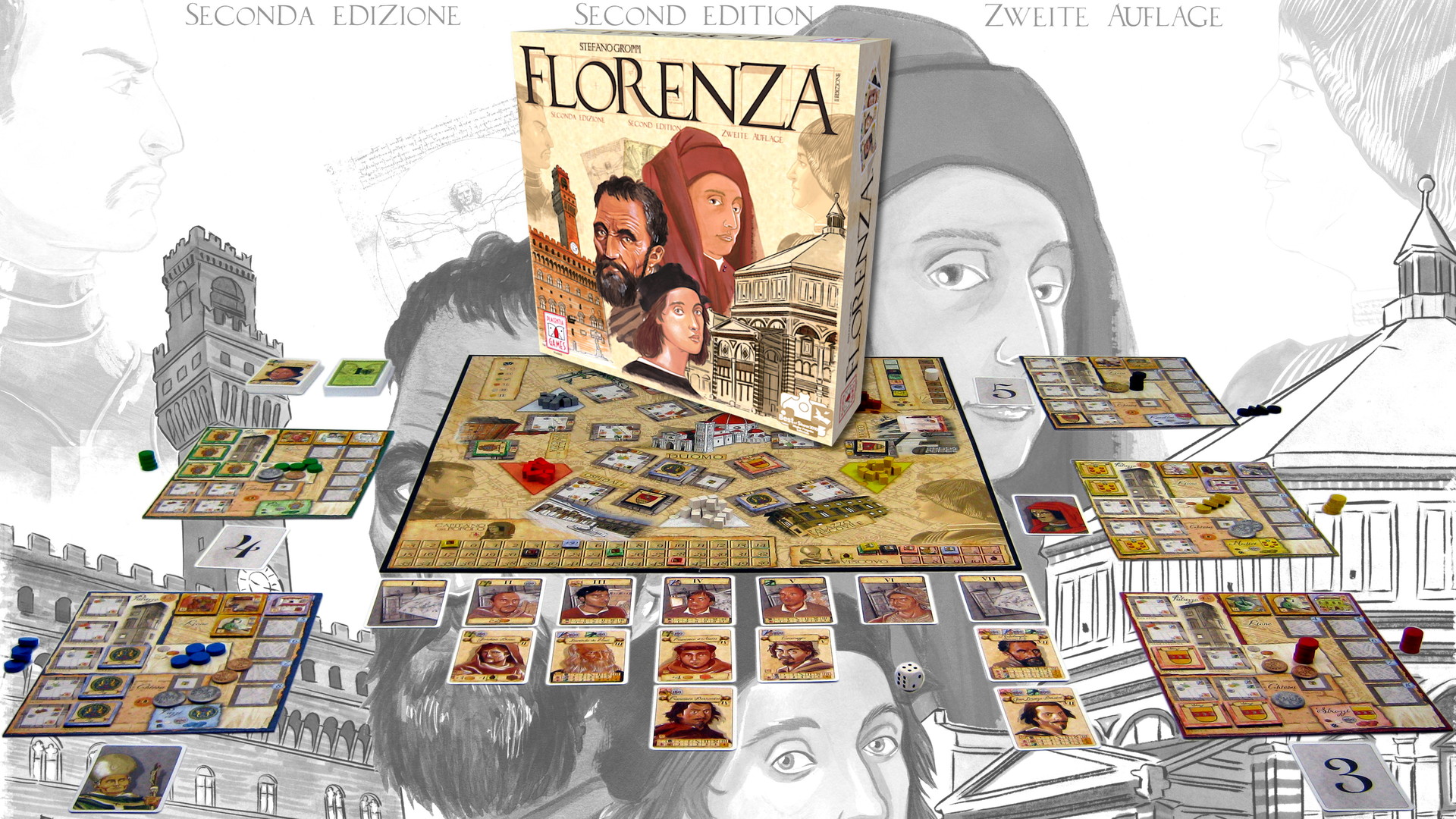 In Florenza, the players are the heads of the most powerful families in Florenza during the Renaissance period. The goal of the game is to become the most famous patron of the arts by hiring the most famous artists of the period and financing their works.