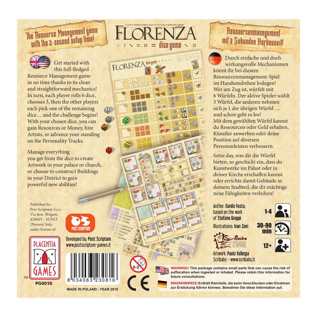 Each player can commission artworks in his own district, the Cathedral, or in the civic buildings of the city. Each artwork requires money and resources to complete. To earn the money and resources the artists need, the players send their workers to labor in various workshops, possibly even in their opponents’ districts. Additional workers can be earned by offering charity to the church. During the game, players will earn prestige points, primarily by completing artworks. prestige points can be spent during the game, but at the end of the game they will be the player’s primary source of victory points.