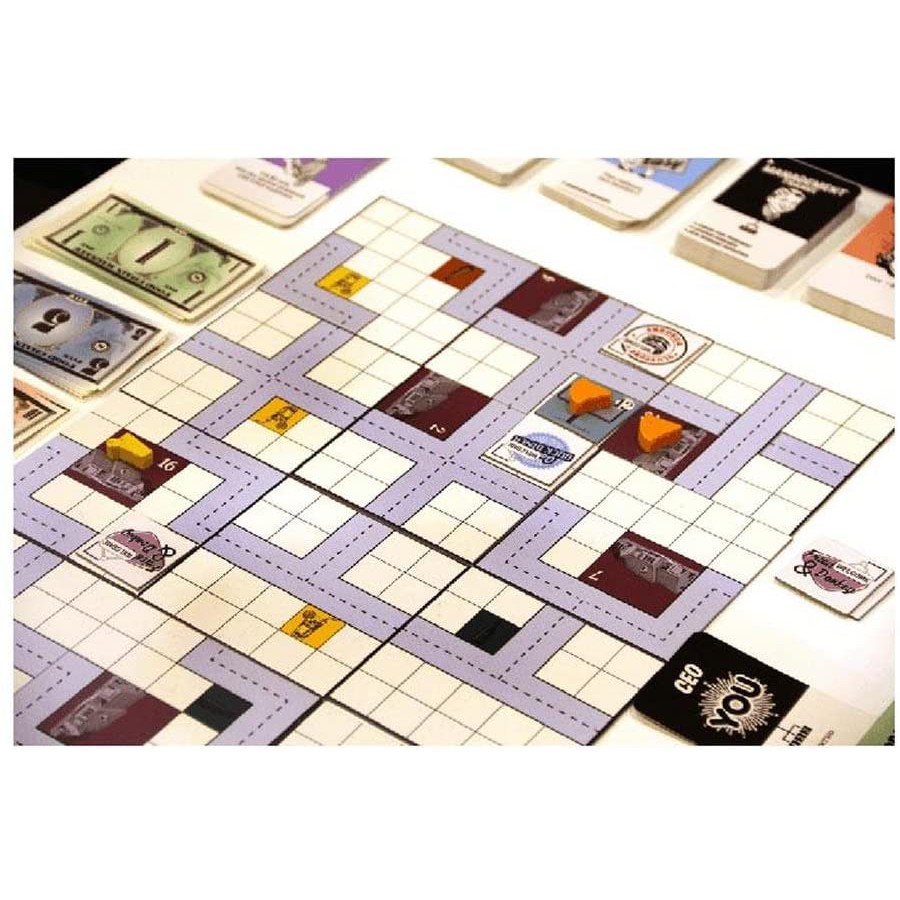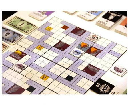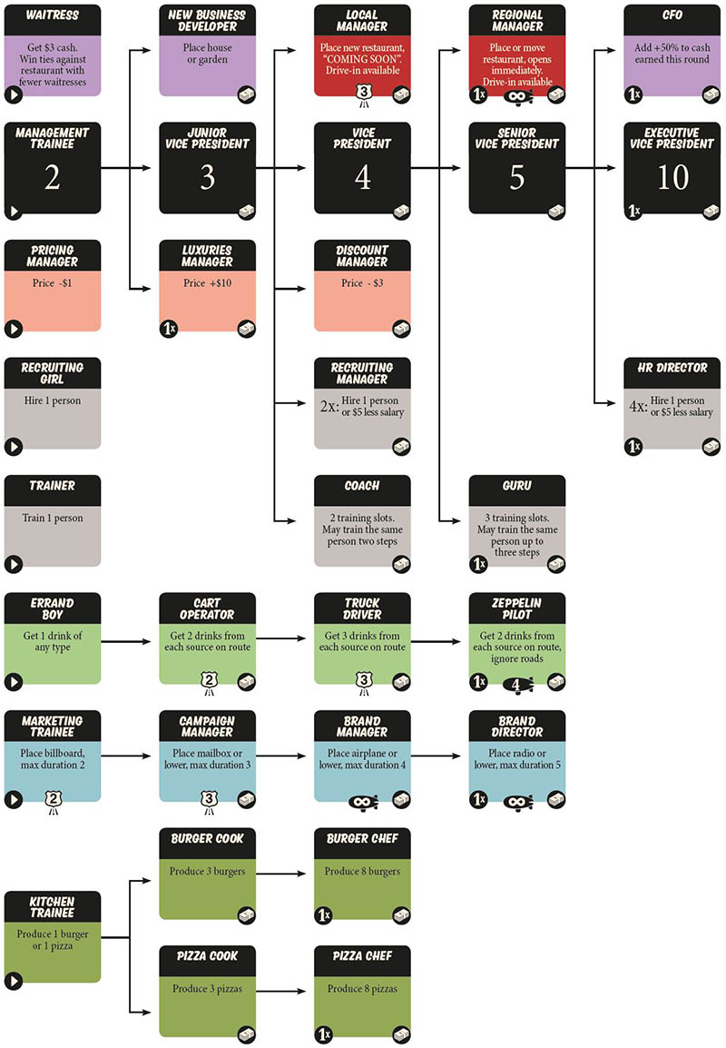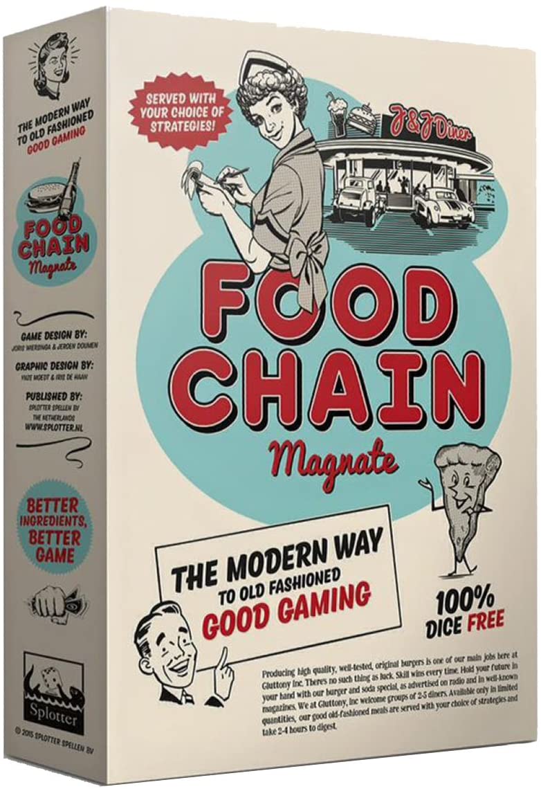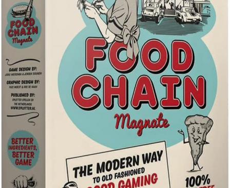 Food Chain Magnate is a heavy strategy game about building a fast food chain. The focus is on building your company using a card-driven (human) resource management system. Players compete on a variable city map through purchasing, marketing and sales, and on a job market for key staff members. The game can be played by 2-5 serious gamers in 2-4 hours.