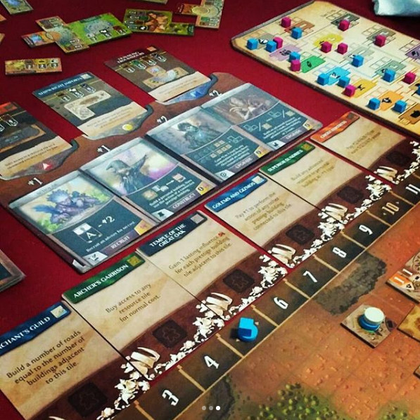 In Founders of Gloomhaven, players use action cards to place resource buildings on the map of the city, use these resources to create more advanced resources, then deliver them to proposed building sites to earn prestige. An individual player, however, cannot do everything on their own because they can import only a small number of resource types, depending on their race. To create more advanced resources, they have to work with other players.