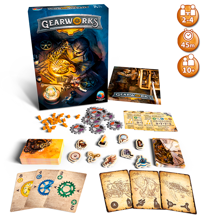 Gearworks is a puzzle-style board game featuring card placement, hand management, and a "twist" on area control. The game is often described as "Sudoku meets steampunk."