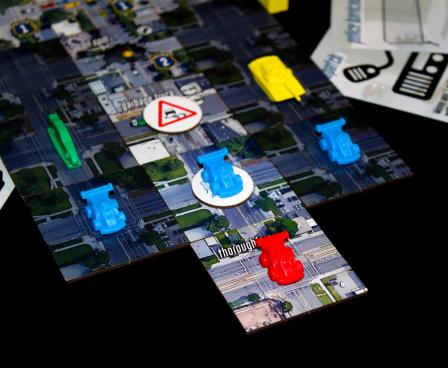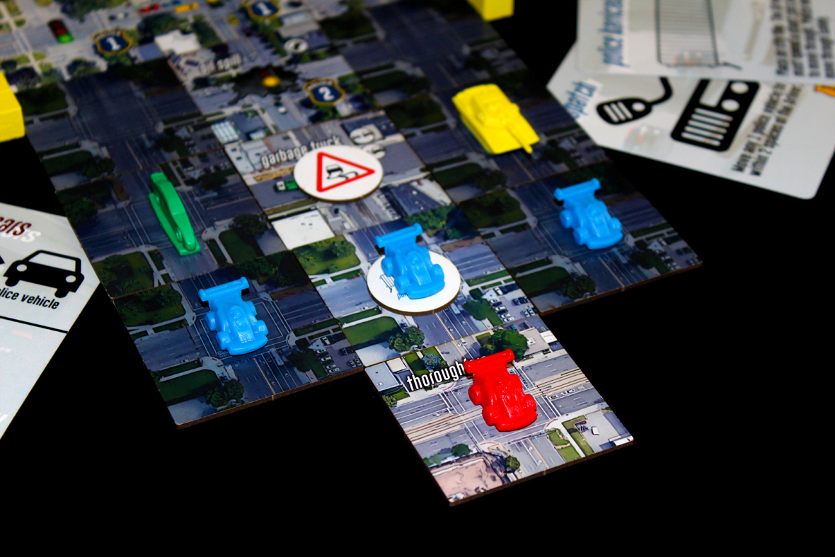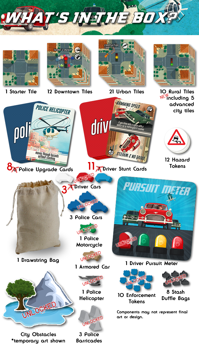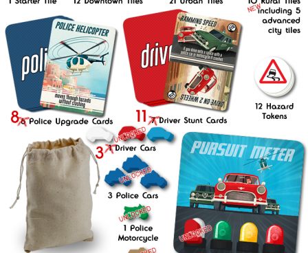Each turn, the Police secretly build out the city and move their vehicles, working to corner the Driver and steer them towards the areas of the city that expand the police force. The Driver burns through their stunt cards, picking up stashes along the way. If the last city tile is placed, the Driver escapes out of town. However, if the police increase the pursuit meter to its final space, the Driver is caught.