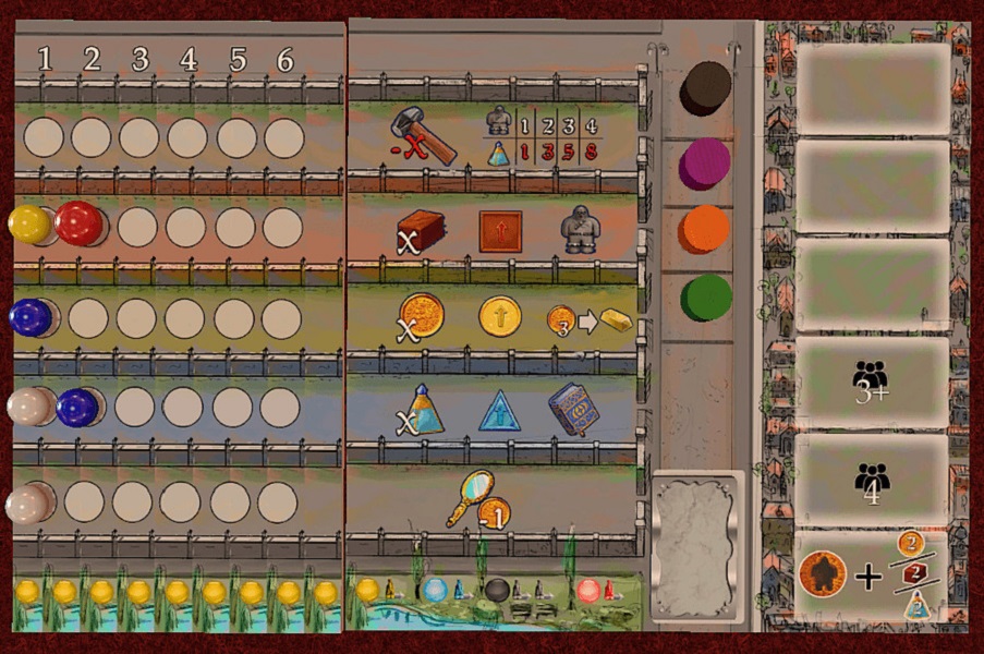 At the beginning of each round, the players will shuffle the colored marbles into the 3D synagogue that will split them into five lines corresponding to the five main actions available in the game: