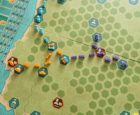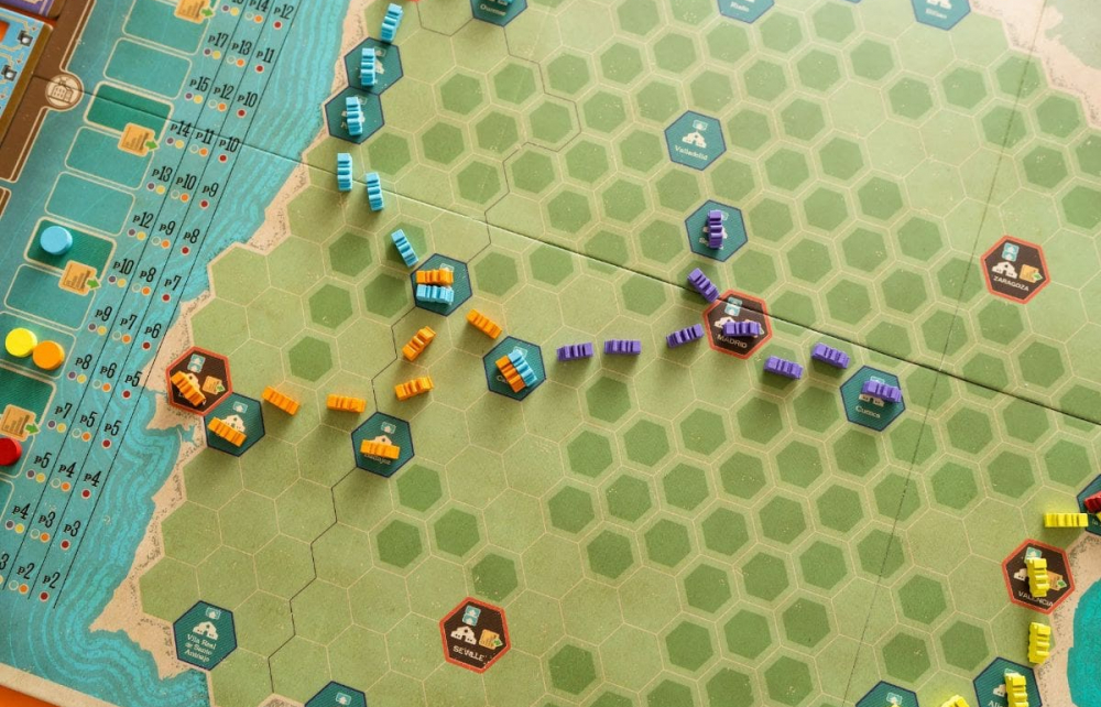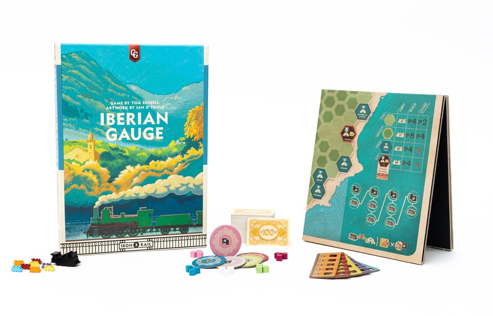 In Iberian Gauge, you will invest in railroad companies during Stock Rounds. In the Operating Rounds, each share of stock allows the shareholder to build track for that company, in the order those shares were purchased. But building in such hostile terrain is expensive! Leasing track from other companies reduces cost and keeps your railroads expanding. Failure to expand will sink your stock values, leading to ruin!