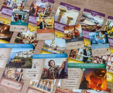 In Khôra: Rise of an Empire, you are the ruler of a resplendent city in Ancient Greece. It's up to you to develop it faster and better than your opponents. You can make many political choices in each round, and philosophy, legislation, culture, trade, and military will shape the future of your city. Optimize your dice rolls, collect taxes, send your army to colonize foreign lands, unlock achievements, and make sure your city will shine throughout all of Greece!