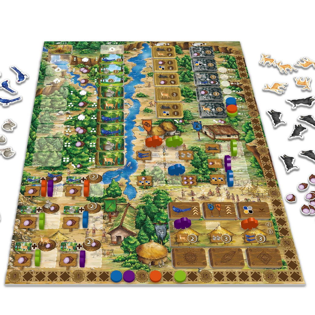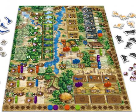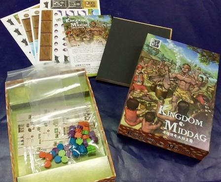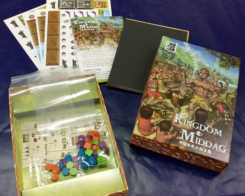 In Kingdom of Middag, players are the leader of their own tribe who tries to lead their people to a fruitful harvest and glory. By sending tribe members to the hunting field, Tool Hut, Trade Hut, or Worship Hut, players will gain different preys, improve their hunting skills, or trade preys for victory points. The dynamic changes in the hunting field challenges players to optimize their action timing to gain the most useful resources and turn them into VP efficiently. The player who earns the most VP will become the new king and transcend the greatness of Kingdom of Middag.
