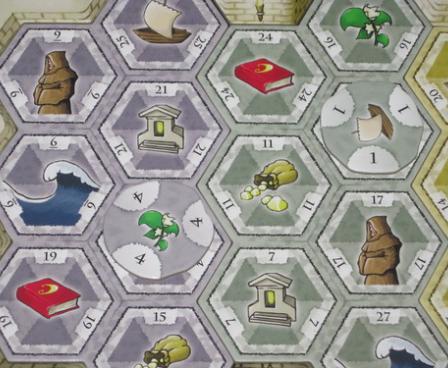The players move their novices over seven islands surrounding a temple island. The novices are placed according to the "worker movement" principle, i.e. they aren't placed at the beginning of a round, but instead start where they ended the round before. Thus, novice movement is an important part of a round: Only if you're in the right place at the right time, you'll gain the deciding influence points. You'll have to build new shrines, work at the temple, and participate in the Priestess' divine services. But don't forget to recruit additional novices or win the favor of the local Priests; these are vital means to prepare and combine the diverse actions.