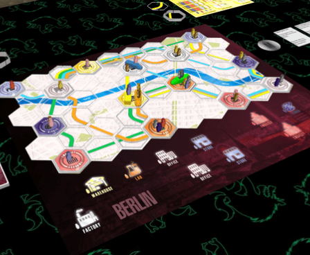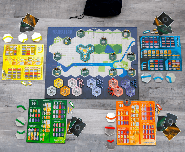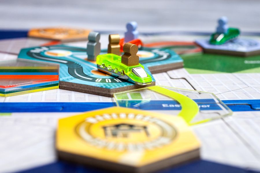 Efficiency is your key to success in this pick-up-and-deliver, tile-laying, engine-building game. Transparent tiles allow your route to overlap your opponents' tracks, winding you along from station to station. Robots efficiently upgrade and adjust your abilities, leveraging unique goals to maximize points. By the end of the game, the game board has morphed into a modern subway map, with brightly-colored routes connecting stations all over the city.