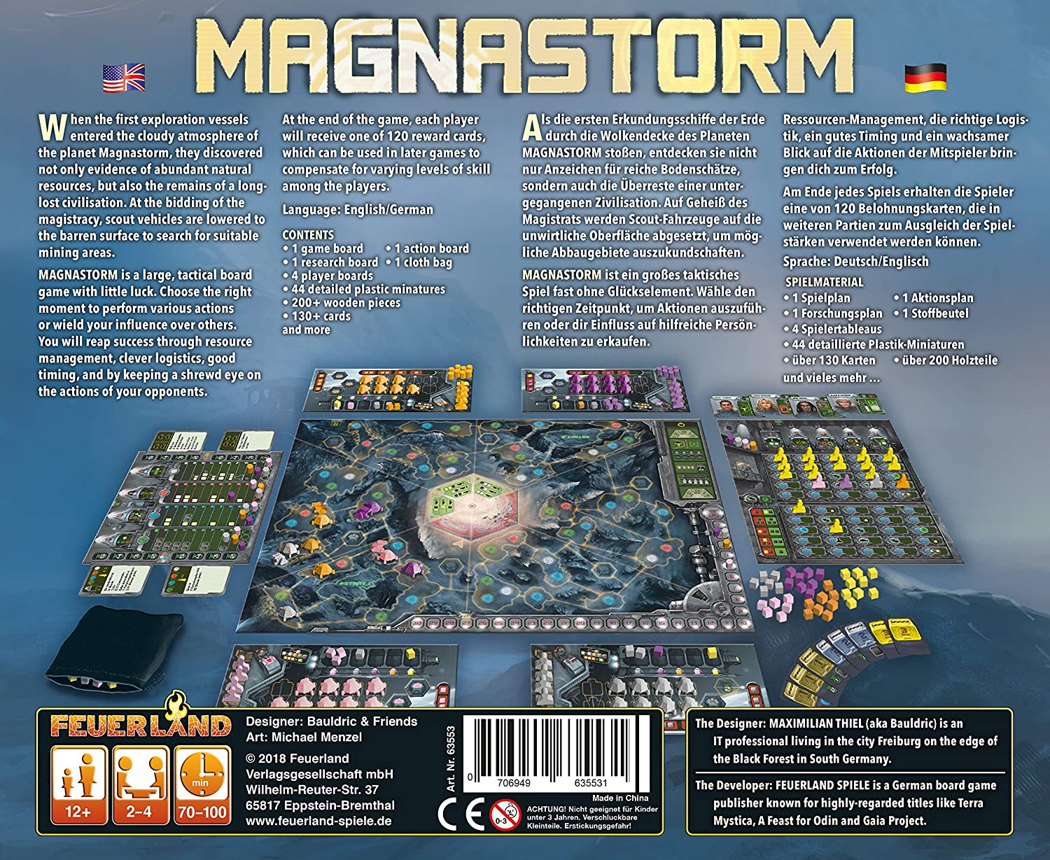 Magnastorm is a big, tactical board game with very little luck. Choose the right moment to perform actions or buy influence over helpful commanders. You will reap success through resource management, clever logistics, good timing, and a shrewd eye on the actions of your opponents. At the end of the game, each player receives one of 120 reward cards, which can be used in later games to compensate for varying levels of skill among the players.