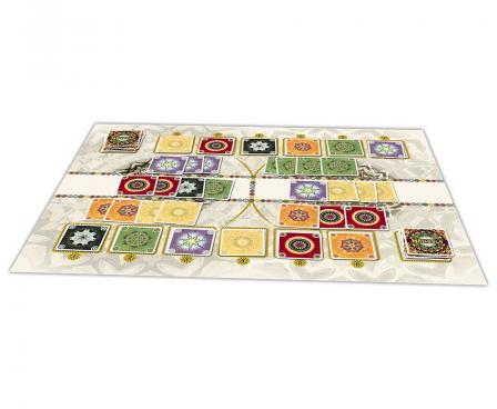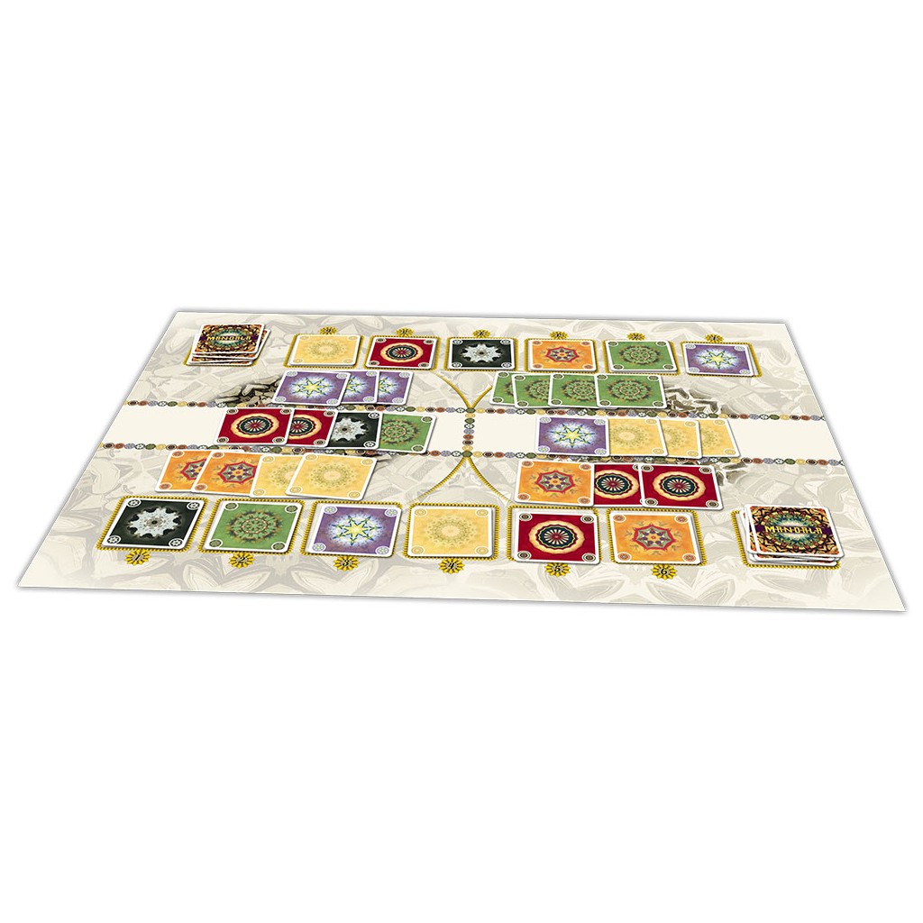 In the two-player game Mandala, you are trying to score more than your opponent by collecting valuable cards — but you won't know which cards are valuable until well into the game! Over the course of the game, players play their colored cards into the two mandalas, building the central shared mountains and laying cards into their own fields. As soon as a mandala has all six colors, the players take turns choosing the colors in the mountain and adding those cards to their "river" and "cup". At the end of the game, the cards in your cup are worth points based on the position of their colors in that player's river. The player whose cup is worth more points wins.