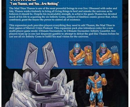 Marvel: Crisis Protocol – Thanos provides players everything they need to add Thanos, the Mad Titan to their games of Marvel: Crisis Protocol. This expansion pack also introduces rules for a new multi-player game mode: Ultimate Encounters. In "Ultimate Encounter: Infinity Gauntlet", two players team up in one last desperate gamble to attempt to defeat Thanos before he can use all six Infinity Gems to fulfill his mad vision for the universe.