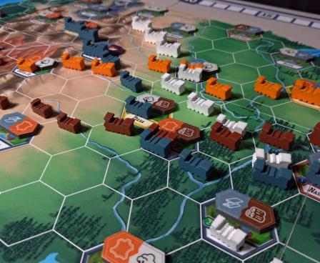 To lay track, you take train pieces from the company's reservoir on the game board and place them one per hex to expand that company's network to a new city. When you do this, you gain influence in the goods that are in demand in that city. (The game includes four types of goods, and each type of good is the same color as one of the railroad companies.) Each city can have at most 1-3 companies enter it, and when that limit is reached, you remove the demand tile from the game. When you build into a hex (whether landscape or city), any other train companies in that hex gain a train in their reservoir (to represent them profiting from how your efforts affect that area).