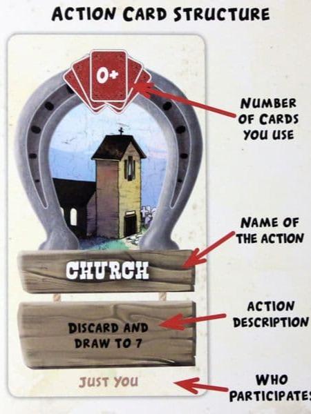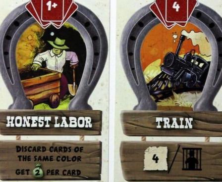 Three alternate "night-time" actions are included on the backside of the action cards to spice up gameplay. Honest Labor turns into Dishonest Labor, Church turns into Saloon, and Duel turns into a good ol' fashion Shootout (the more the merrier)!