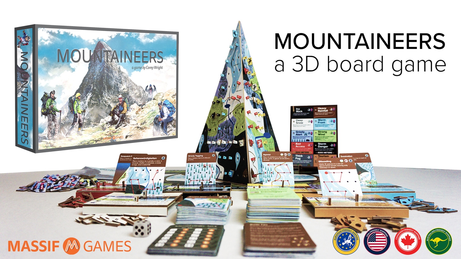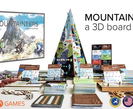 Mountaineers is a strategic board game in which 1-6 players compete against each other and AI climbers to earn climbing points (victory points) as they maneuver around a 18 in./45 cm tall rotating 3D modular game board. The theme of Mountaineers is lighthearted and fun, primarily focused on competitive route finding, resource management, character building and upgrades, while challenging players to react to various exciting (and sometimes comical) events that occur on the mountain.