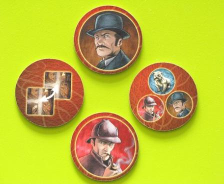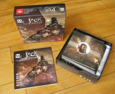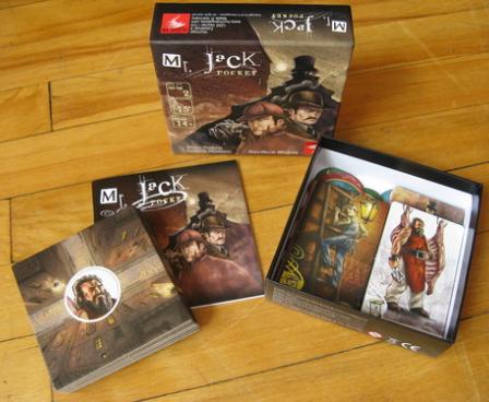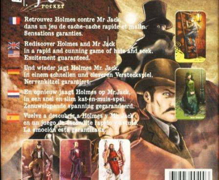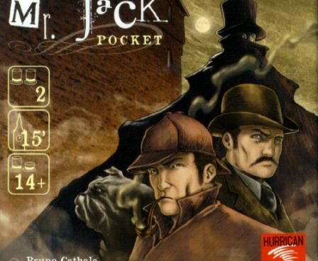It has been found again by Bruno Cathala and Ludovic Maublanc with Mr.Jack Pocket, the small card game derived from Mr. Jack. The board is replaced by a square grid made of nine street cards. The suspects, and among them Mr.Jack, are pictured on the cards. Holmes, Watson and a dog are turning around the grid, a system already used by Bruno Cathala in several games, and can look at the streets in a row or column. Every round, like in Mr.Jack, four actions are available. The first player selects one, his opponent two, and the first player then uses the last remaining action. Actions allow moving a detective one or two spaces clockwise around the grid, turning a card in order to change the view of the streets, swapping two street cards or drawing an alibi card. At the end of the round, Mr.Jack states if he can be seen by one of the detectives. Of course, the detectives must identify Jack, who must stay hidden long enough to escape.