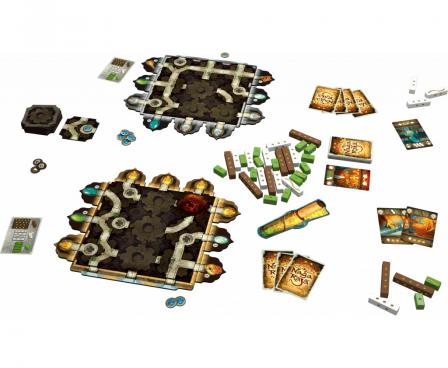 In this 2-players game, each player moves around their own temple, which has spaces for room tiles and hiding places for 9 sacred and cursed relics around. These relics are placed randomly, facedown, around the temples and worth victory points once flipped face up.