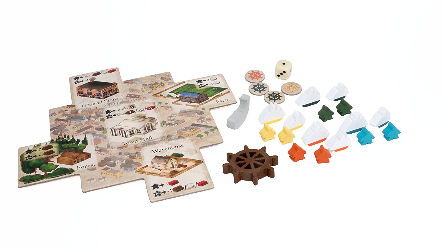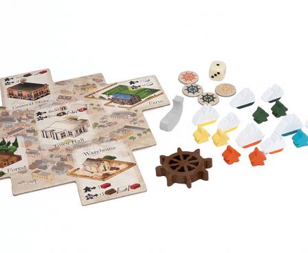 In more detail, over twelve rounds players take turns placing two workers per round, one at a time. The town board and whaling board contain basic game actions: taking goods (food, wood, brick), selling goods, building buildings, docking ships, and launching ships. These actions can be used multiple times per round, with the first player to do so in a round receiving a bonus or more goods or reducing the number of goods paid.