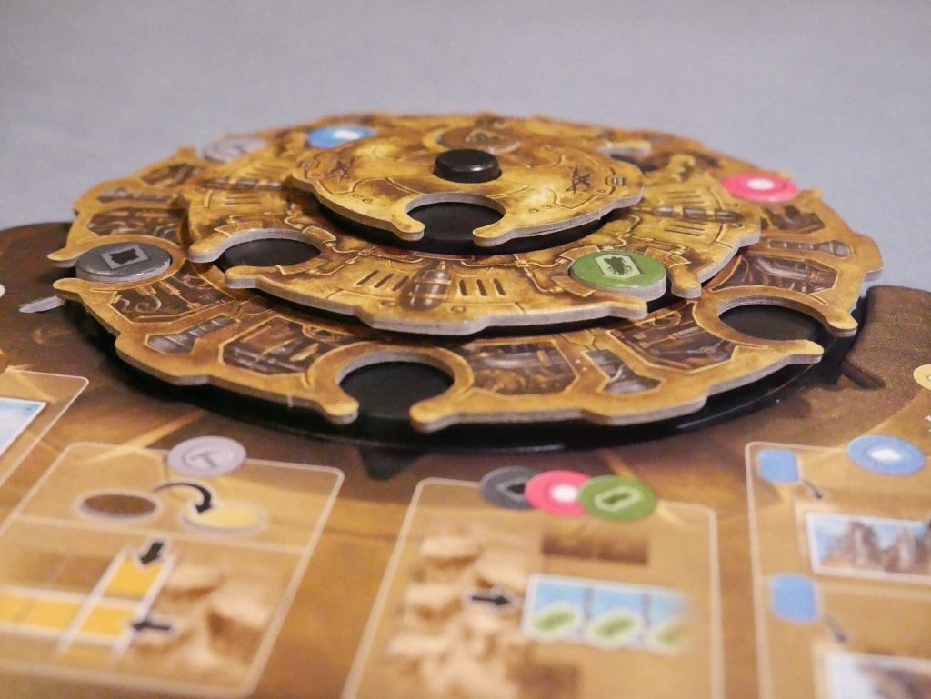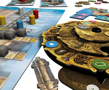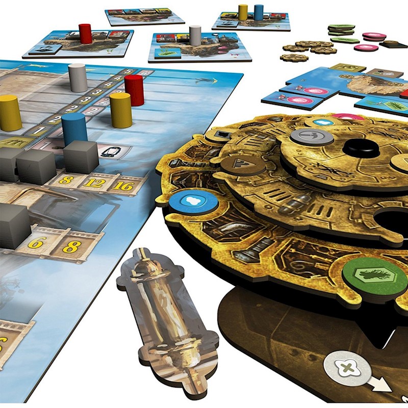 Noria is the debut title from Sophia Wagner, winner of the Spiel des Jahres fellowship in 2015. The talented, young author created an entirely new steampunk universe specifically for this game, and artists Michael Menzel and Klemens Franz have managed to bring her vision to life. At the center of the game is an innovative mechanism called "wheel building". Each player has an action wheel consisting of three rings, with slots for a number of different action discs. Over the course of the game, players try to obtain new discs and manipulate the rings of the wheel to optimize their action selection. Additionally, to ensure their investments bear fruit, they also need to bribe politicians with knowledge.