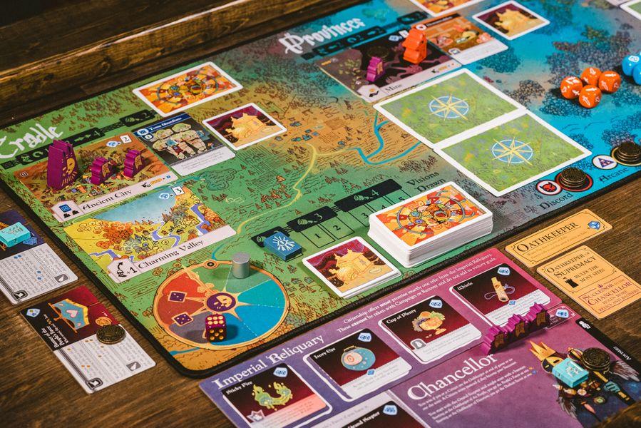 In Oath, one to six players guide the course of history in an ancient land. Players might take the role of agents bolstering the old order or scheme to bring the kingdom to ruin. The consequences of one game will ripple through those that follow, changing what resources and actions future players may have at their disposal and even altering the game's core victory condition.