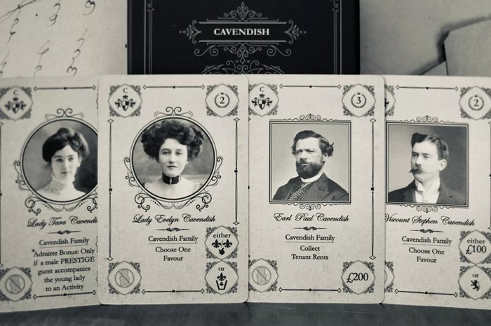 Each turn, players choose a building tile representing a room or outdoor space in and around their 19th century British country house. The tile chosen dictates the event that can be hosted and the guests to be invited. Players must carefully plan, however, to have the proper staff available to service the event and support guests as needed. The reward for success is new investment opportunities, permitting further renovation of the estate (acquisition of more valuable/powerful building tiles), an increase in reputation in the county, an expanding circle of influential acquaintances, and a larger and highly-trained domestic staff.