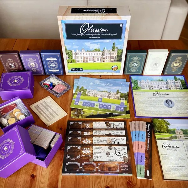 Obsession is a game of 16 to 20 turns in which players build a deck of Victorian gentry (British social upper class), renovate their estate by acquiring building tiles from a centralized builders' market, and manipulate an extensive service staff of butlers, housekeepers, underbutlers, maids, valets, and footmen utilizing a novel worker placement mechanic. Successfully hosting prestigious social activities such as Fox Hunts, Music Recitals, Billiards, Political Debates, and Grand Balls increases a player's wealth, reputation, and connections among the elite.