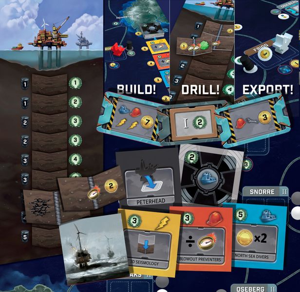 In the game, players build oil platforms in the North Sea. Opening a new oil field is, of course, not easy as it requires both technology and temporary co-operation between players. On your turn, you perform one of three actions: