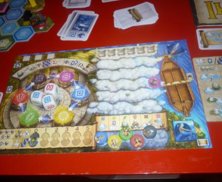 In order to execute these color-dependent actions, you are given three colored dice each turn, the so-called "oracle dice". Rolling the dice (at the start of the turn) is equivalent to consulting the oracle, whereas the results represent her answers. The answers determine which actions you will be able to take, but you will always have three actions per turn. However, a slight divergence from your fate is often possible.