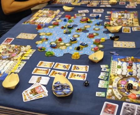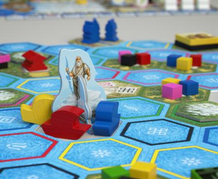 In Stefan Feld's new game The Oracle of Delphi, the player's ships travel across a large variable game board of hexagonal tiles showing islands and the surrounding waters. Each player aims to reach certain islands to perform the twelve tasks given by Zeus: e.g., to collect offerings of different colors and to deliver them to corresponding temples, or to slay monsters of a specific type (and color), all of which can be discovered on the islands.